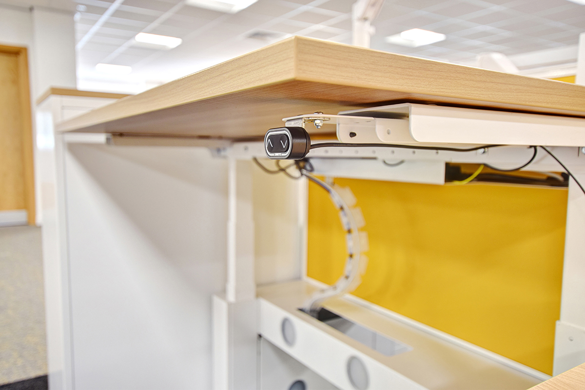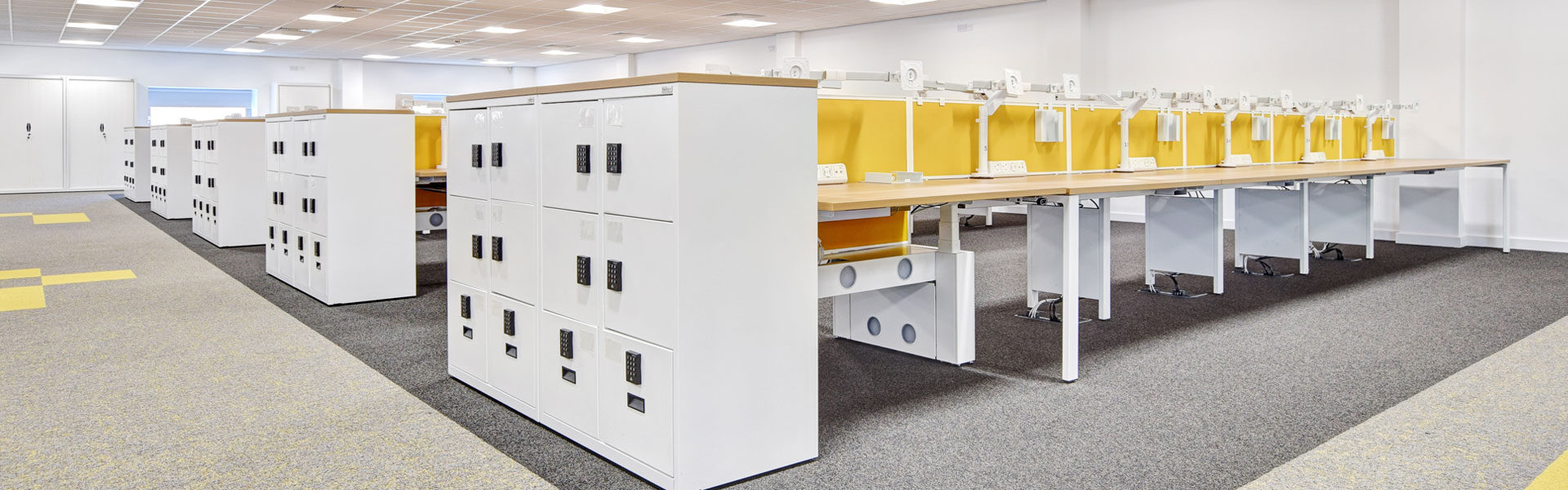At the Newburn Warehouse, we have installed NHS BSA’s standard range of office furniture to keep visual and operational consistency across their various sites. This “standard” range includes our Pico back-to-back bench desking with Jot-Up height adjustable desks on the end, specified with double monitor arms, privacy screens and on-desk electrics for a full IT set-up. The banks of desk have bespoke Freestor Accent lockers on the end for personal storage and feature keypad locks, bottom drawers and label holders.