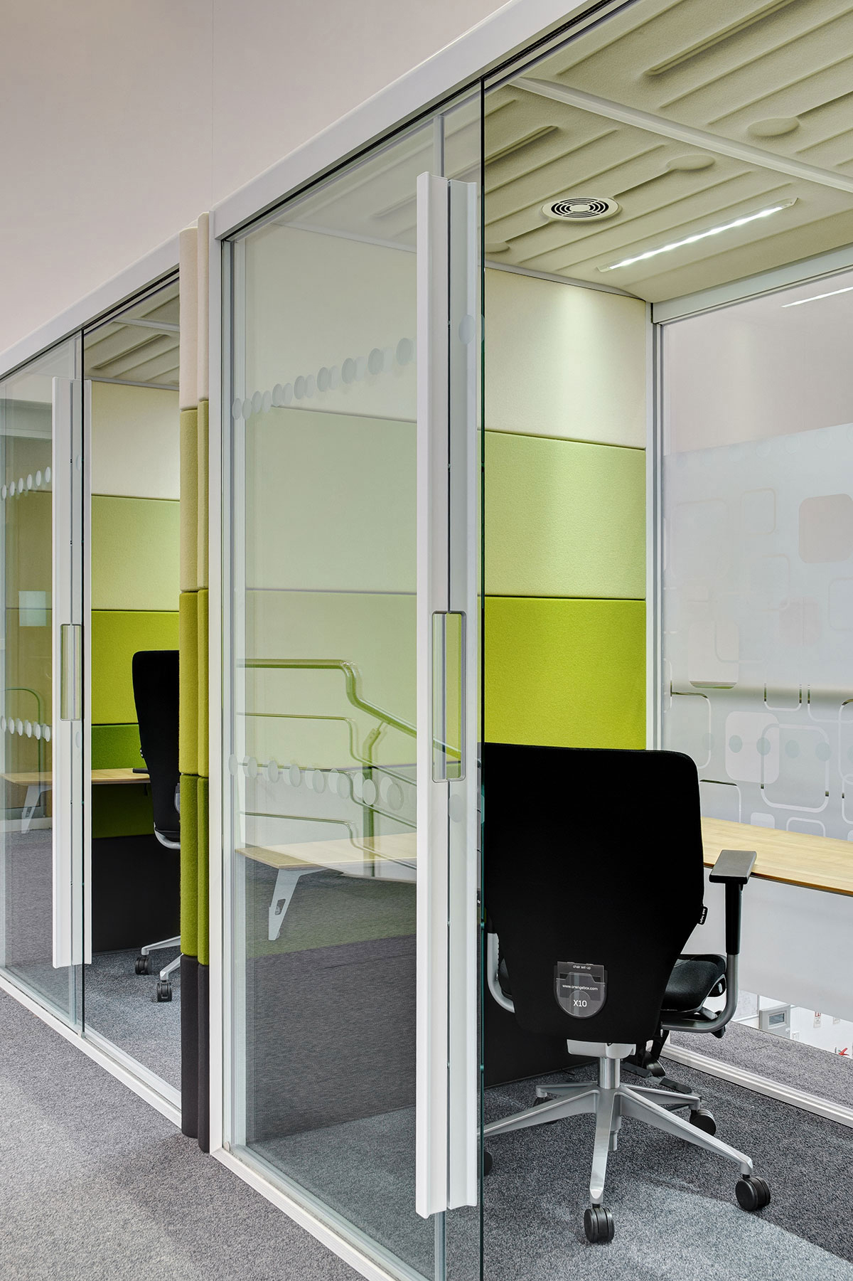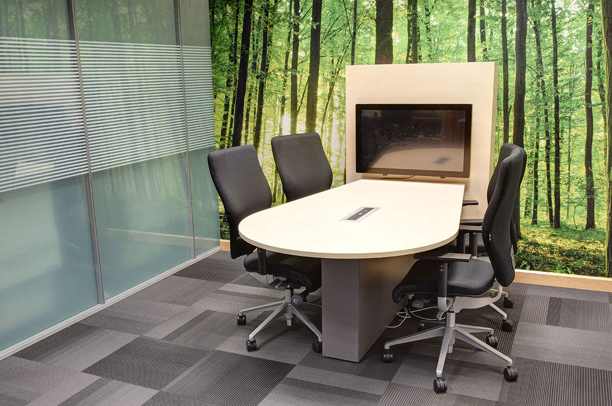 At Stella House areas were zoned off with the use of colours and textures. Using biophilic design to improve staff well being and productivity. The client opted for green grass-like carpeted areas, solid wood work tables and forest motifs to create an organic natural feel, providing a natural boost to creativity. The use of colour also promoted desired behaviours and feelings based on psychological reactions and not personal preference and helps identify the changing characteristics of the zones. A variant of sensory changes helps to stimulate staff and change staff mindsets as they move through the office.