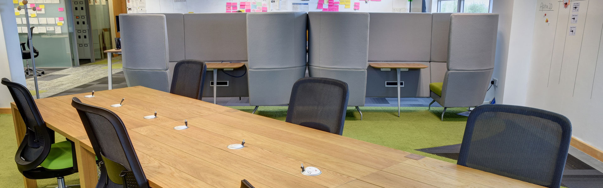 In the design scheme, each piece of furniture was supplied with a purpose in mind. High back booths were supplied for semi-private collaboration spaces. These booths absorb external office noise while encouraging staff to work together without the need to build purpose-built meeting rooms, providing a considerable cost saving, a booth arrangement is also flexible as they can be reconfigured. The booths also duplicate up as a concentration area for staff to break away from their desk and focus on specific tasks.