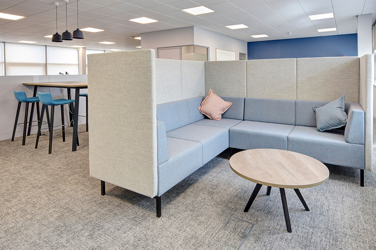 To maximise staff wellbeing, Flexiform installed a mixture of Pico office desks and Jot-Up Lite electric height adjustable desks, complete with a desk privacy screen, dual monitor arms and ergonomic desk chair. We also installed various informal meeting spaces configured from an Additions 2 poseur table and miss chairs for quick chats and collaborations, and a high-sided L shape modular sofa for a comfortable semi-private discussion space.