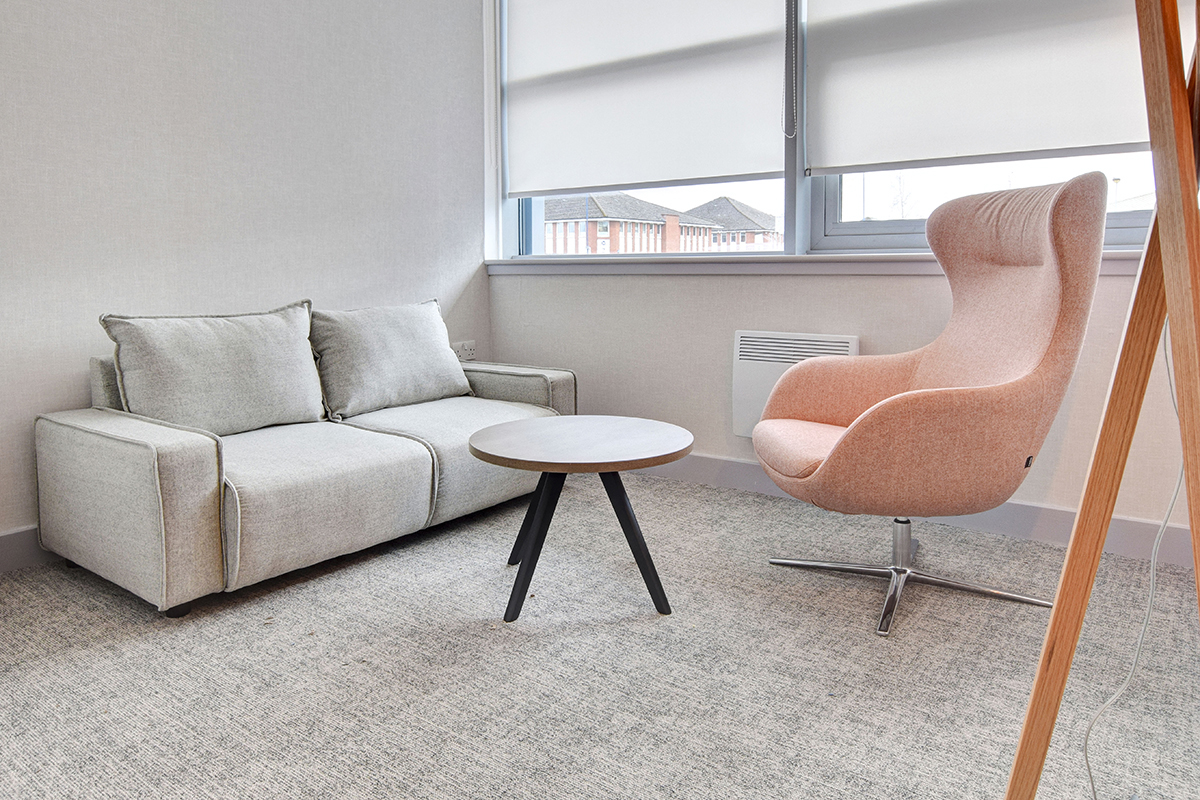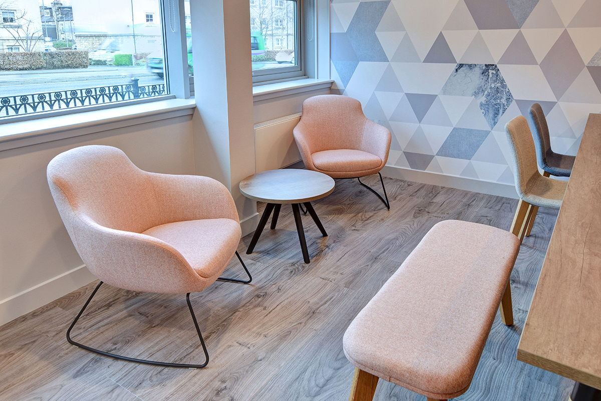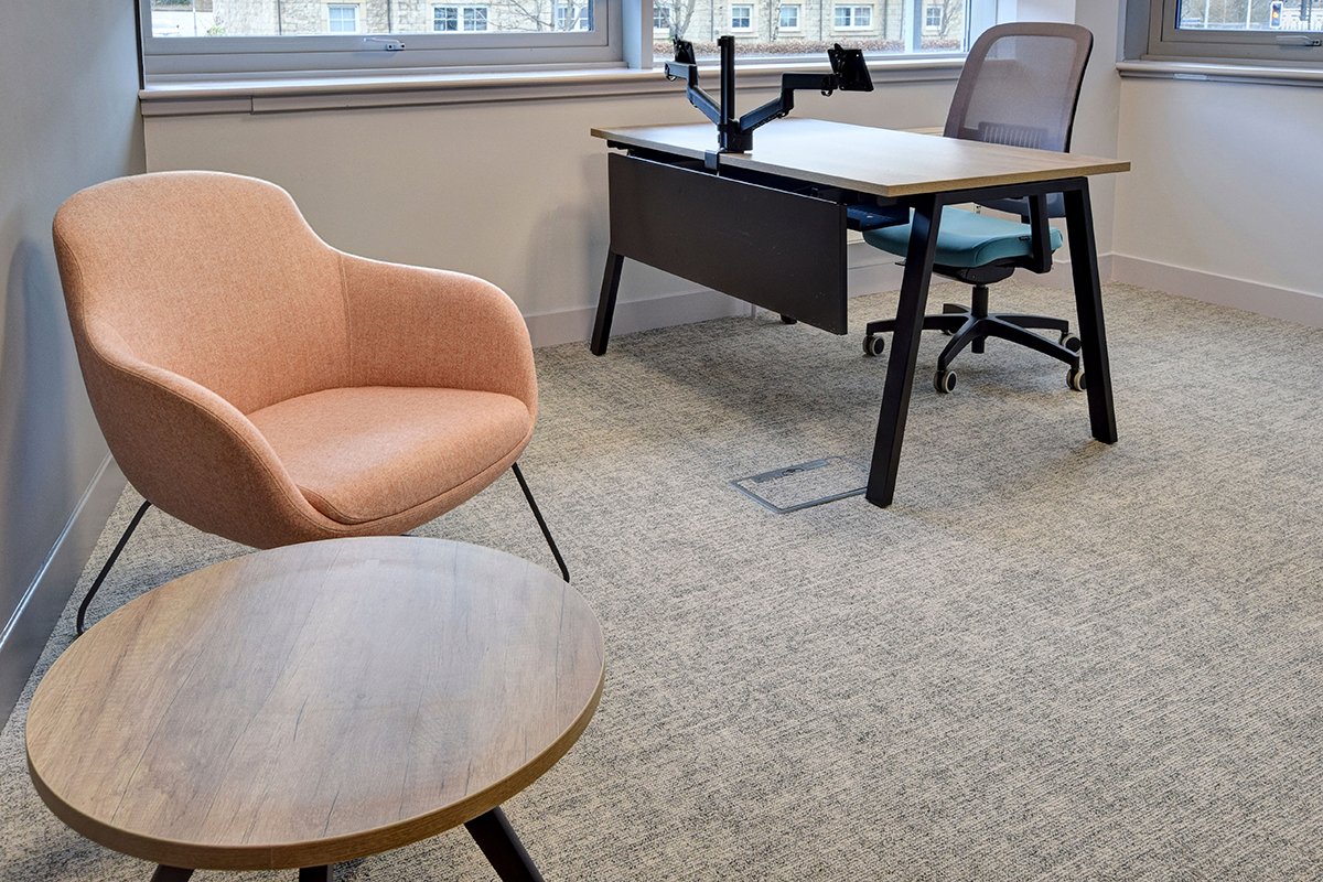 During the office design process, Flexiform we’re able to invite SCRA and Space Solutions to our Scotland Showroom and Hub, allowing the client to try out their preferred office furniture and undertake an in-depth discussion on finishes. Due to the nature of their work which could sometimes be stressful and upsetting, colour and tactile finishes were important factors to ensure staff had a calming, relaxing and positive breakout space and office environment.