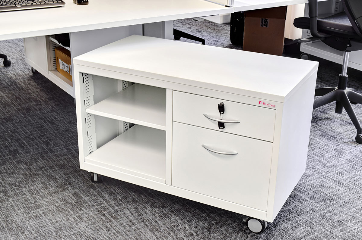 Flexiform installed our Pico Desk back-to-back desk configurations with desk mounted screens for privacy and bespoke storage caddies for instant access to files at the desk. Olio Storage with side filer drawers and bespoke plexiglass back panels were also installed for pocket storage and as space dividers. Flexiform’s Additions 2 Tables with chrome A2 legs were featured in the boardroom for an elegant and formal setting.
