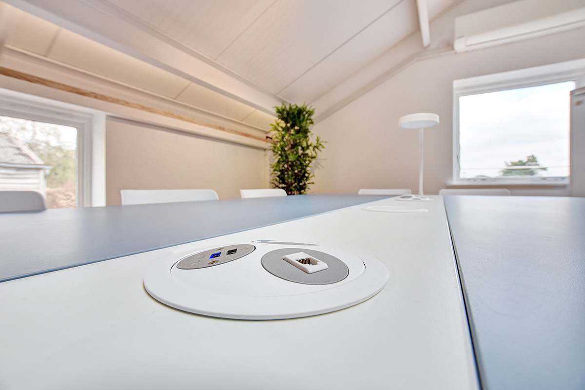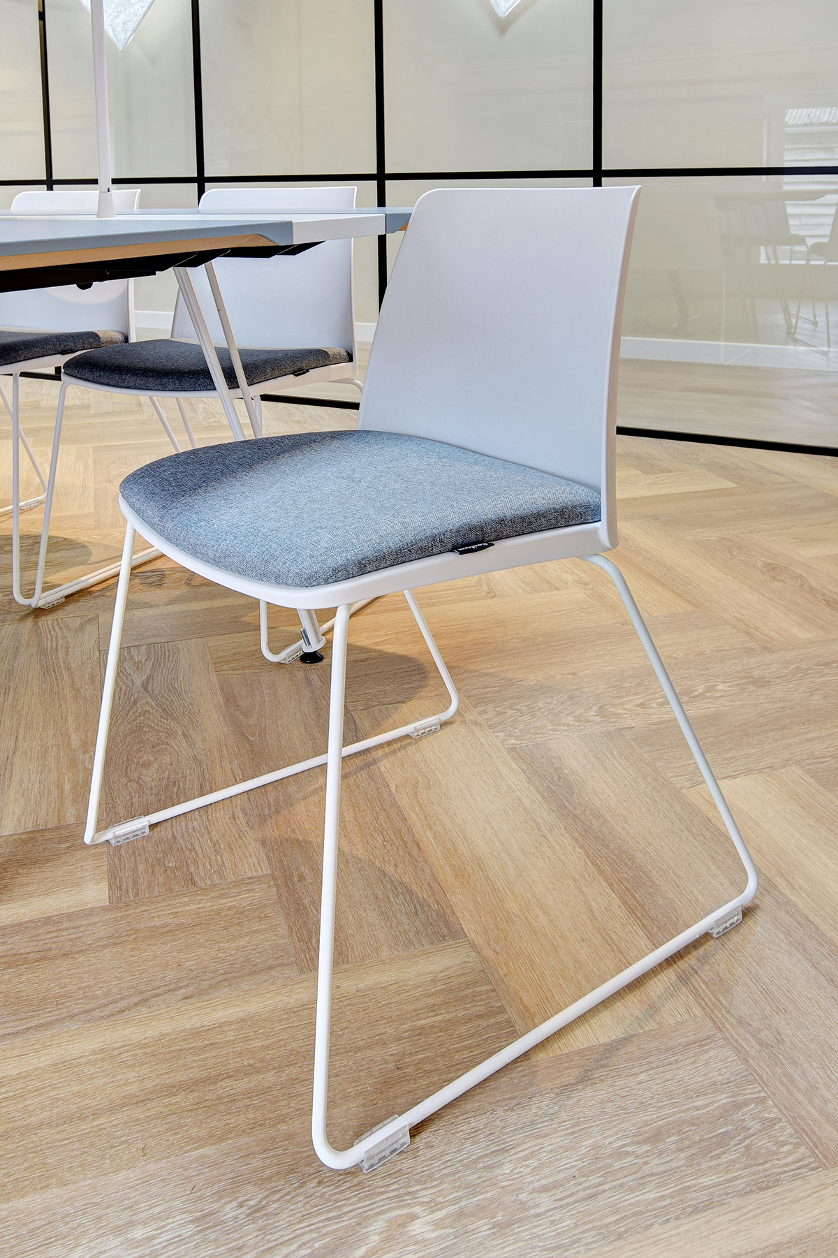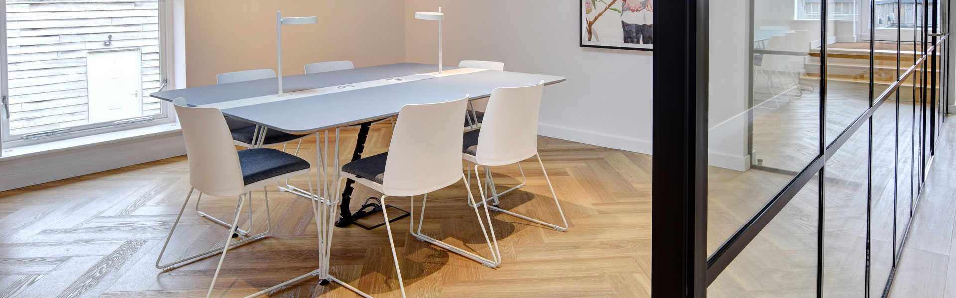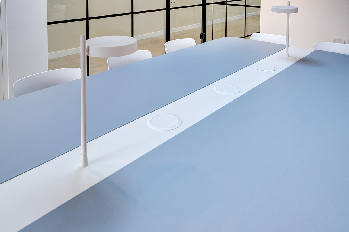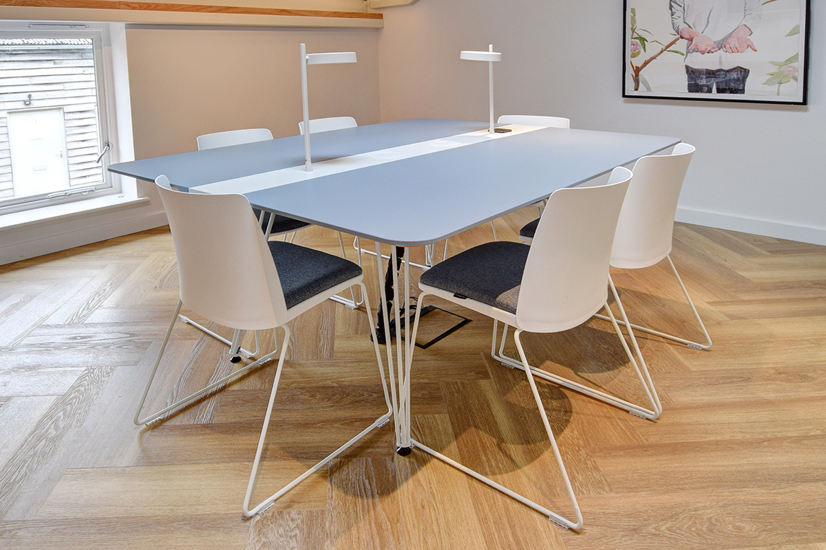 To assist Wildstone in their meeting room refurbishment, we provided a presentation with a range of tables to meet their brief. After browsing the available finishes, Wildstone opted for the Channel work table featuring white hairpin legs and a denim blue laminate worktop with the range’s distinct reverse chamfered edge profile.