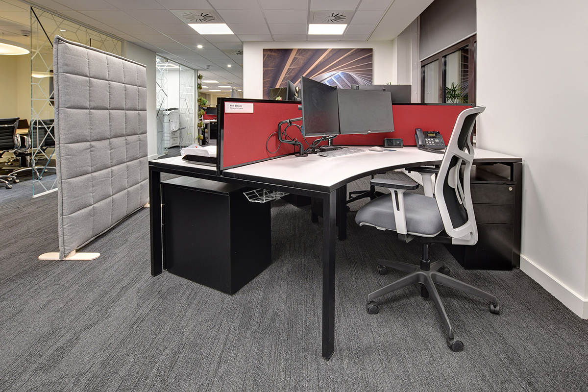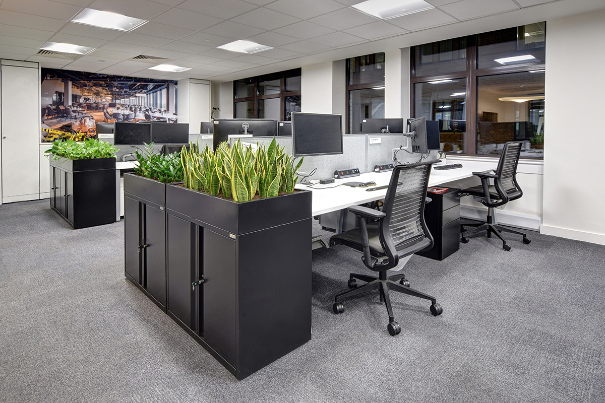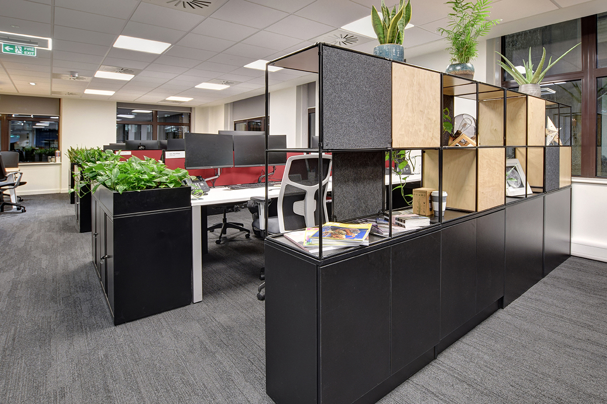 The workstations are made up of our Pico back-to-back desking with a FENIX NTM® worktop, acoustic privacy screens to reduce distractions, and full cable management to ensure a clear workspace. At the end of these desks are our Freestor Hinged Door storage units and planters finished in black. The additional office storage keeps paperwork per department safe and compartmental, whilst the planters add a touch of nature to the workplace, adding greenery and improving airflow. Our Pico 120-degree desks are included in the office design, making for an icon/spacious bank of workstations for the Directors on the floor amongst their teams. Underneath each desk, personal storage is courtesy of our Pedestals again finished in black, specified for storage of personal belongings and documents.