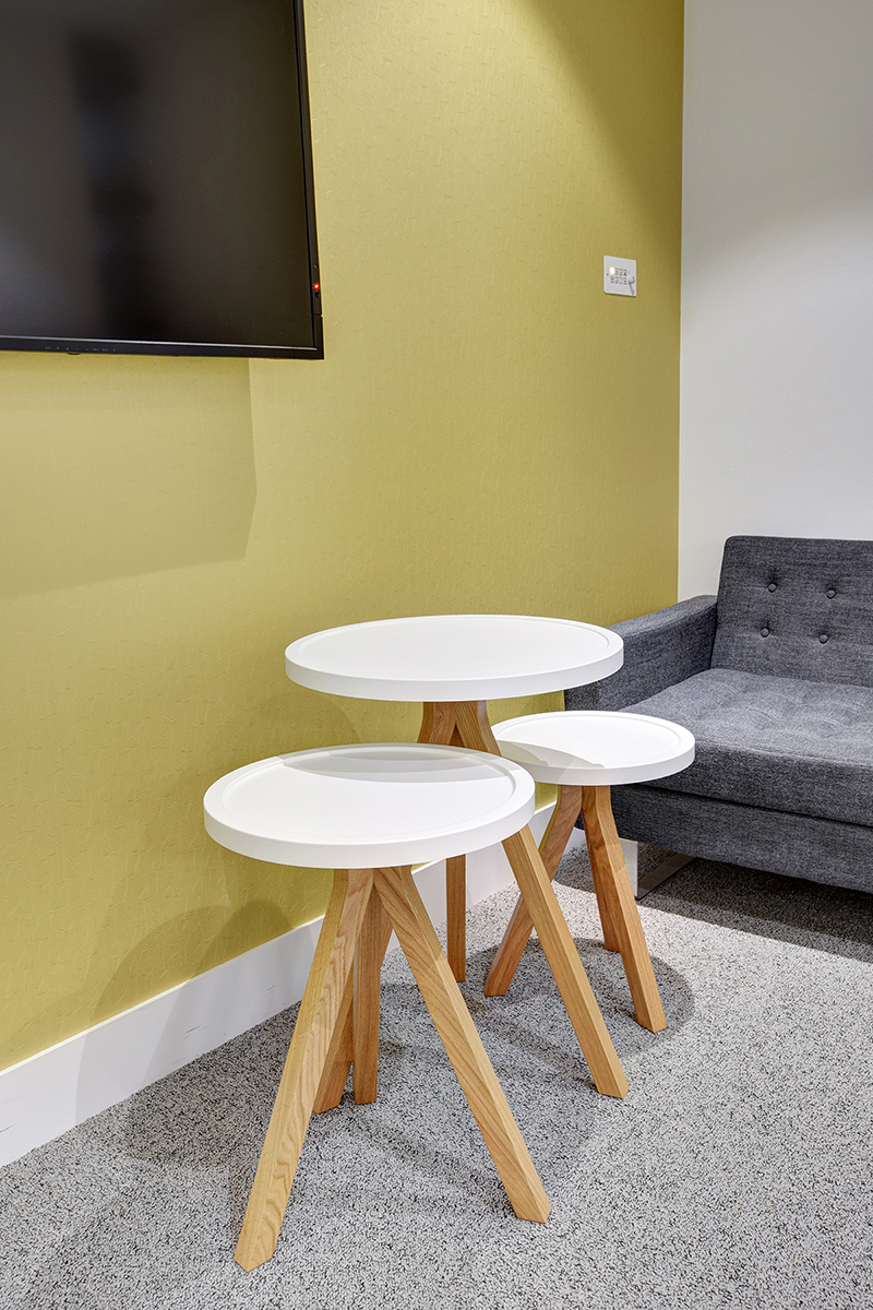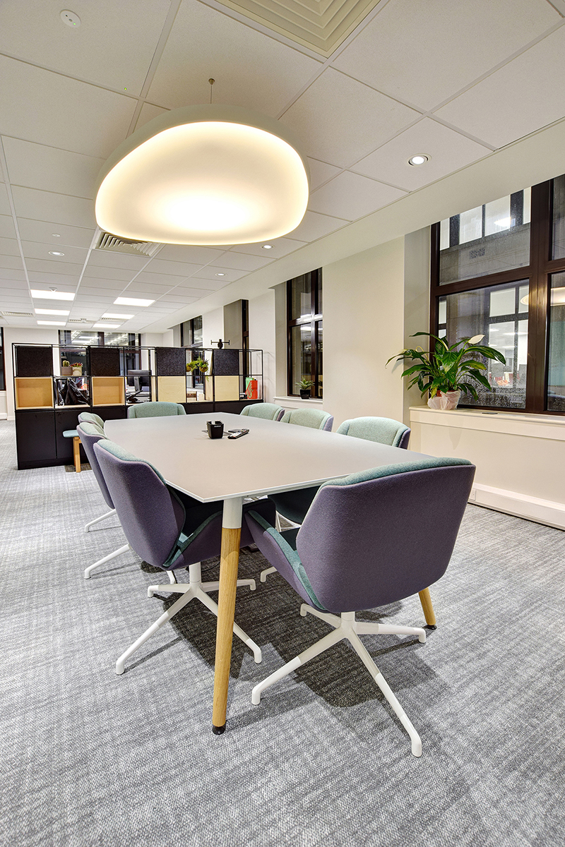 Our Additions 2 tables can be found throughout the open-plan office, with various soft seating and task seating. We designed a bespoke Additions 2 table, creating a shape that allows staff to be inclusive when working as a team. This table includes power and data if staff want to bring their laptops with them. Our Executive flip-top table with bespoke power and data can also be found in many of the ground floor meeting rooms allowing for full layout flexibility and multi-use of the space.