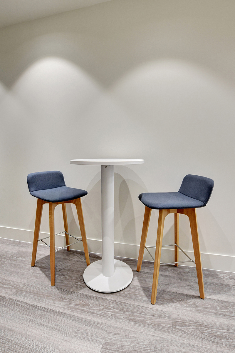 Collaboration areas are scattered throughout the office, made up of our various Flexiform tables featuring a FENIX NTM® top with contrasting chamfered edges and surrounded by a wide variety of both swivel, fixed base and soft chairs. For those who want to work alone or away from their desks, high back single working pods are available with power and data.