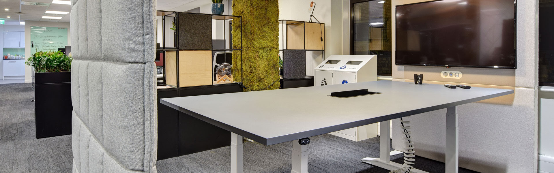 The tables were a selection of low coffee tables all the way up to poseur height benches and beyond, with our Jot-Up Meet sit/stand table carefully kept to itself with some subtle freestanding acoustic panels positioned close by, reducing any unwanted noises or visual distractions.