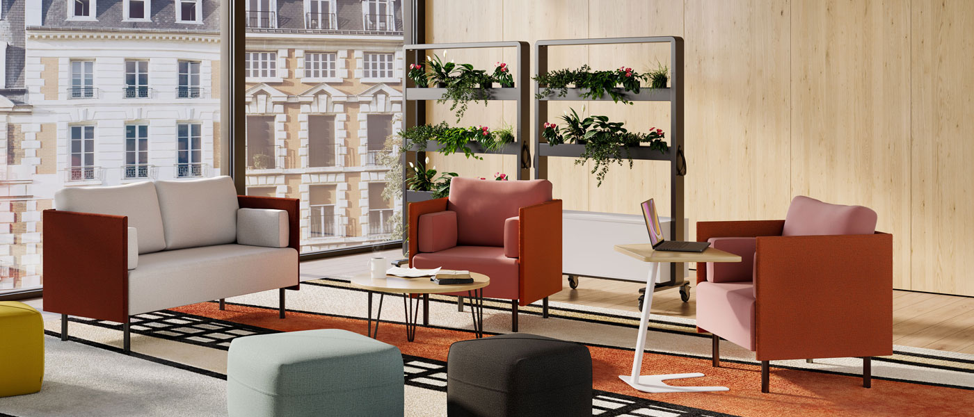 Cote High Back Sofas & Armchairs, Hoop AV Stand, Laptop Table & X Range Table