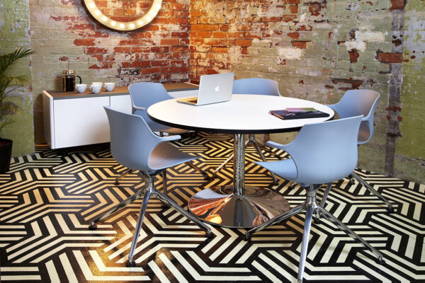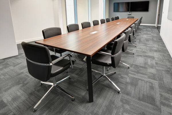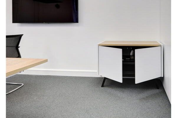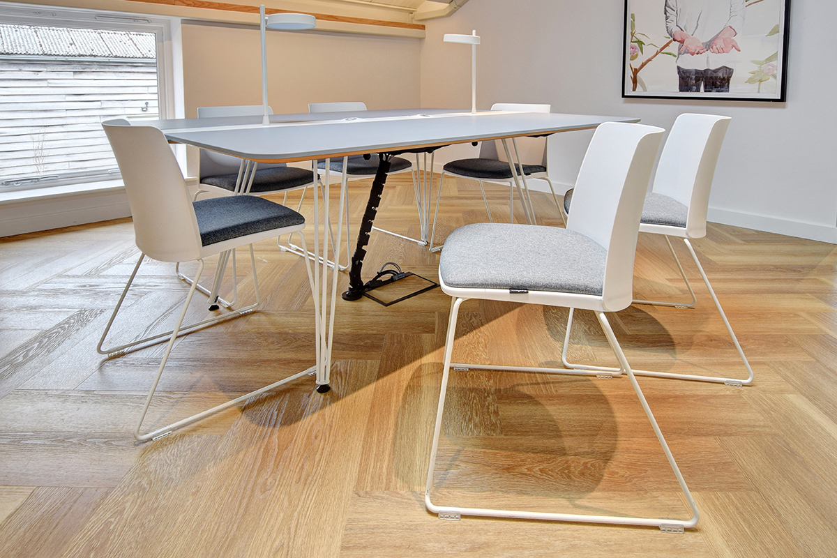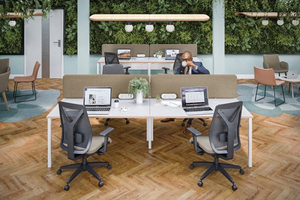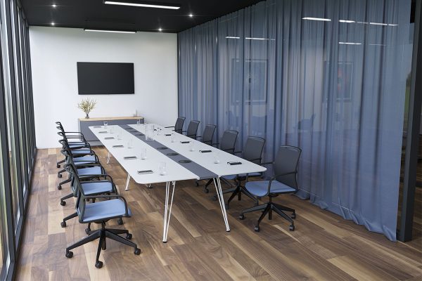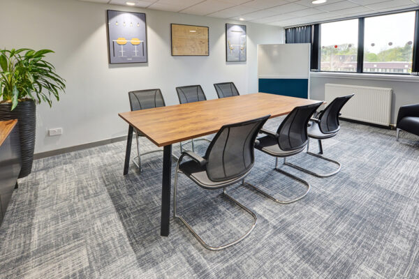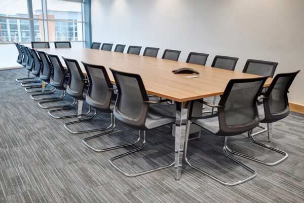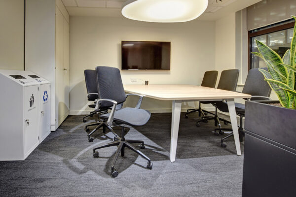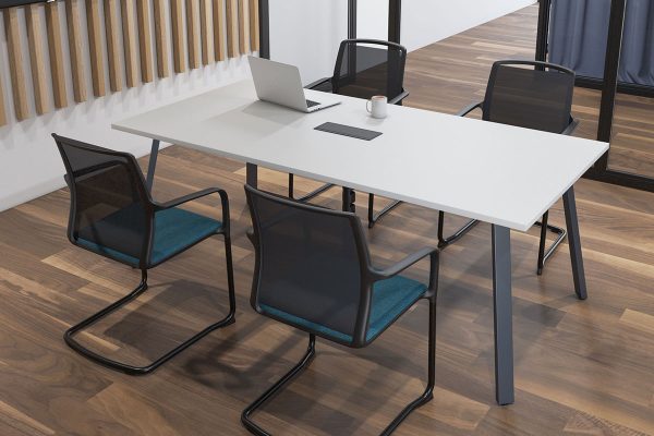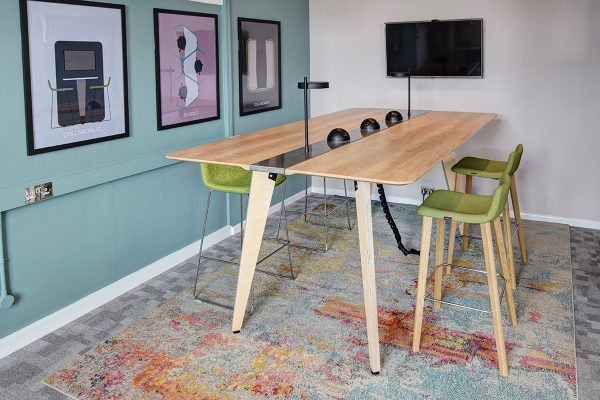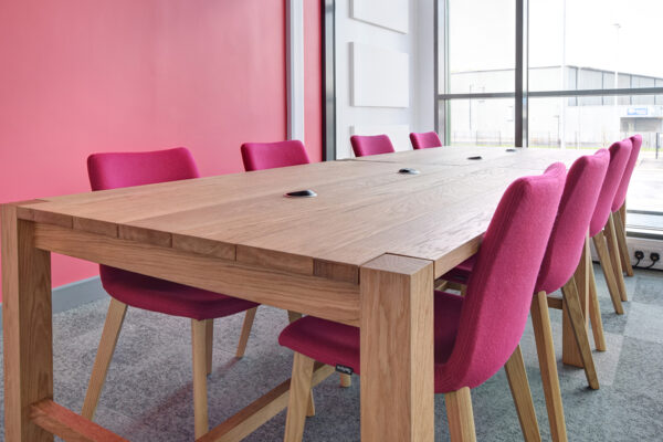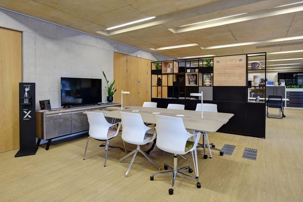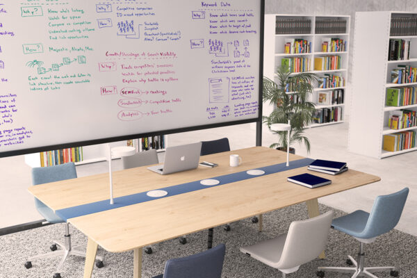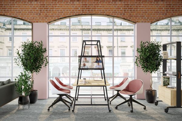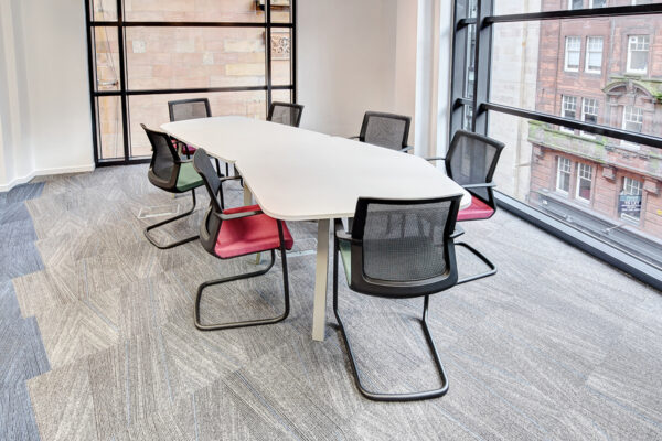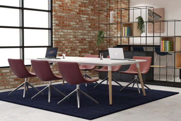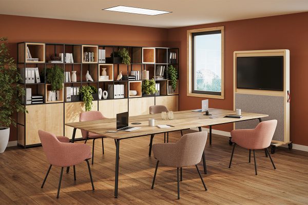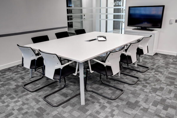 Pype Office Table, Astra Collaborative Chairs, Hoop Media Unit & FlexiGrid Shelving