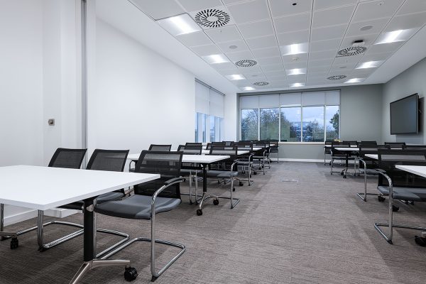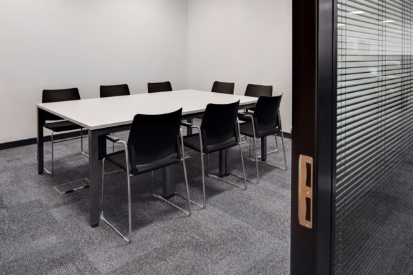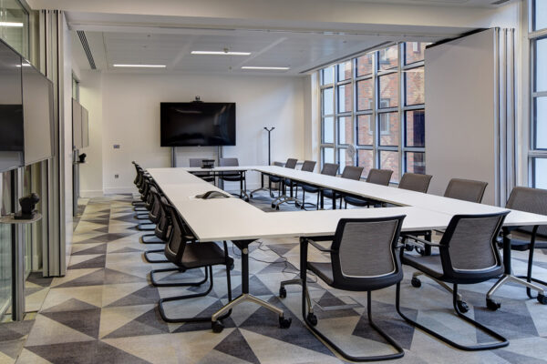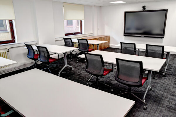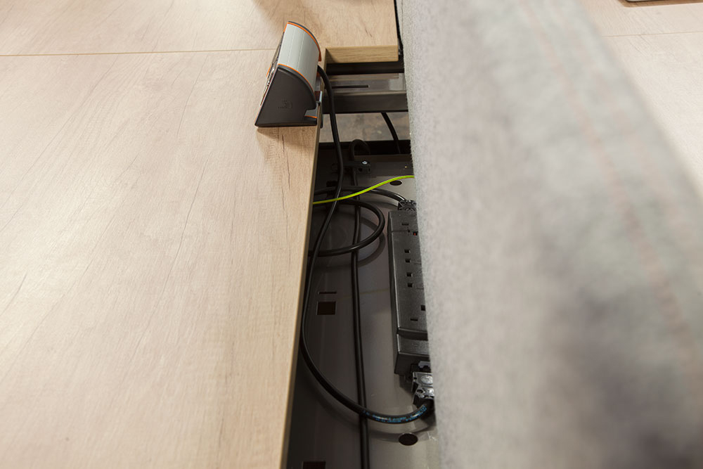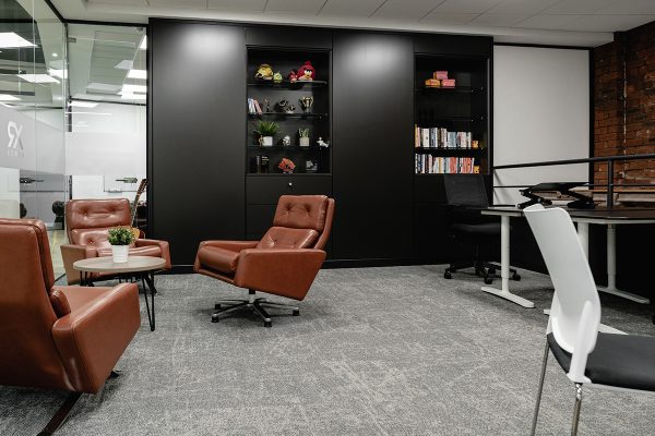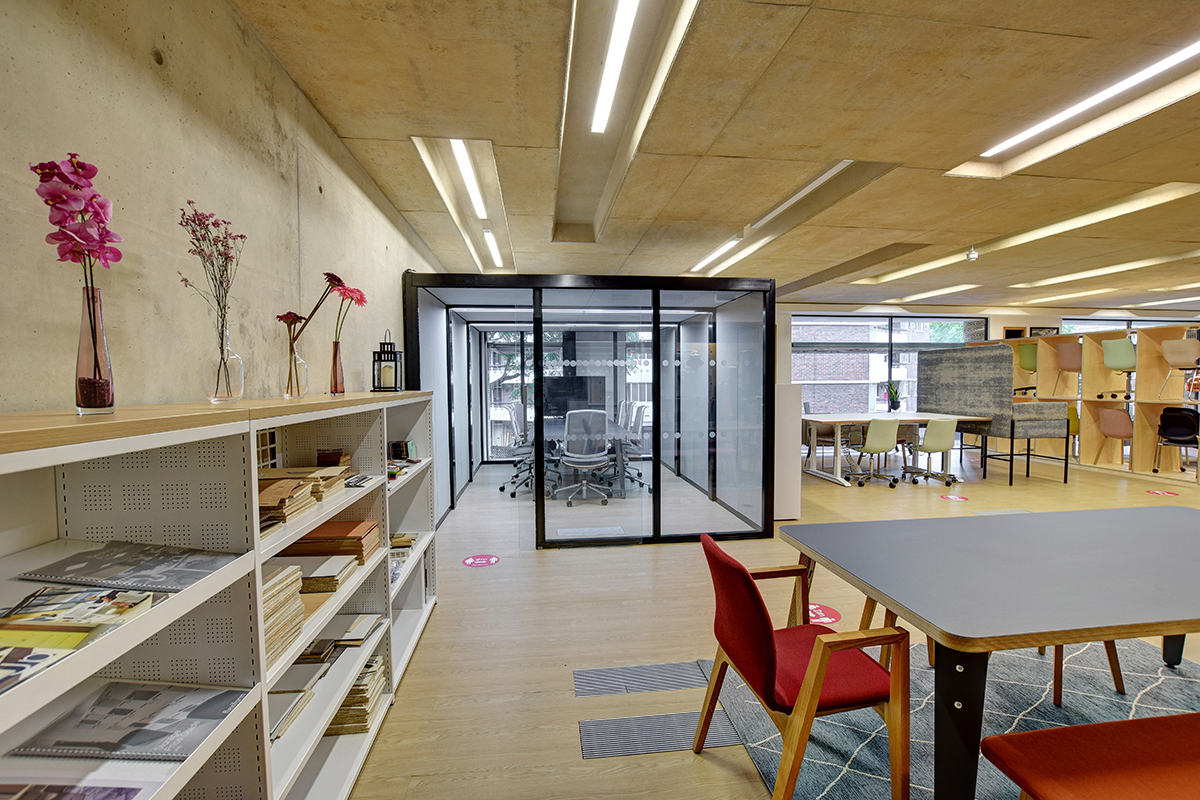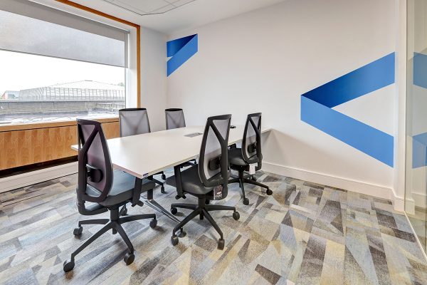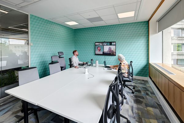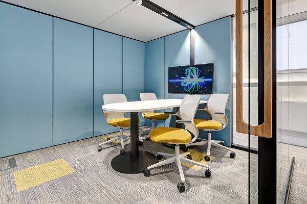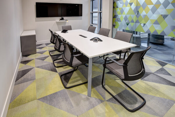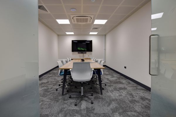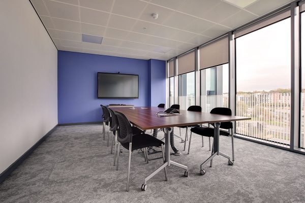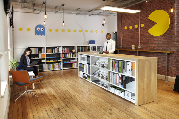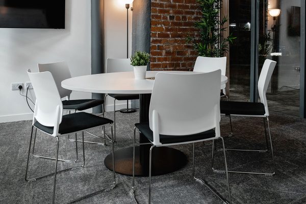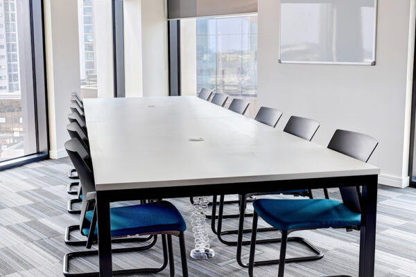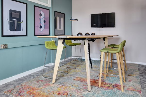 Pype Office Table, Astra Collaborative Chairs, Hoop Media Unit & FlexiGrid Shelving