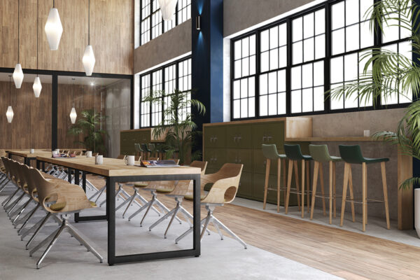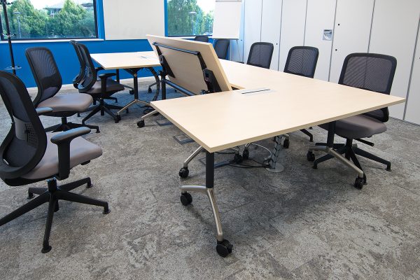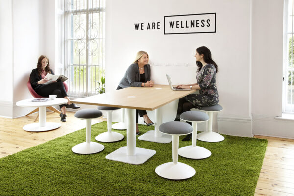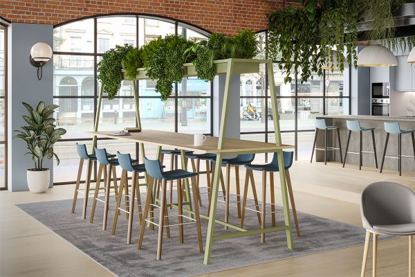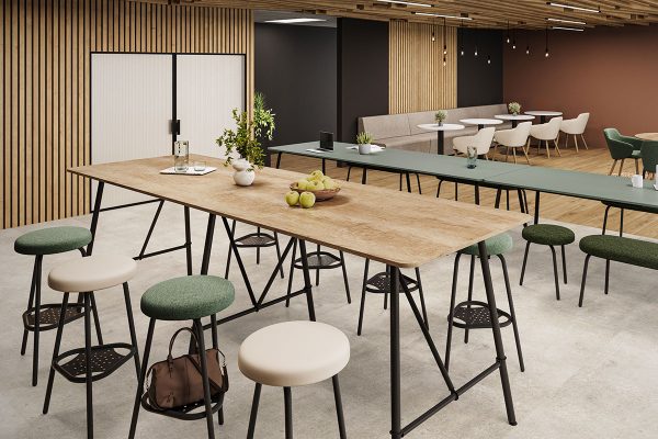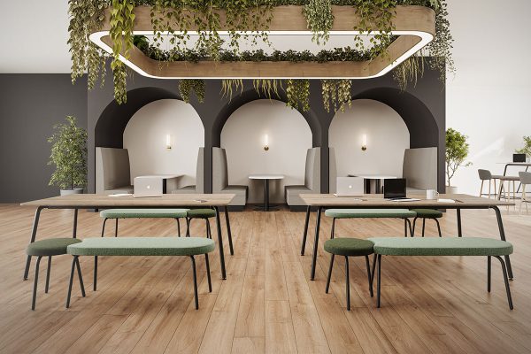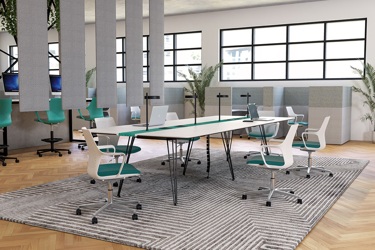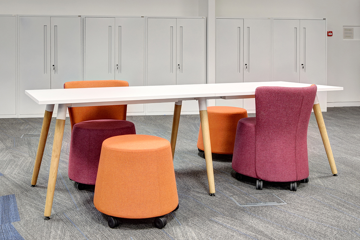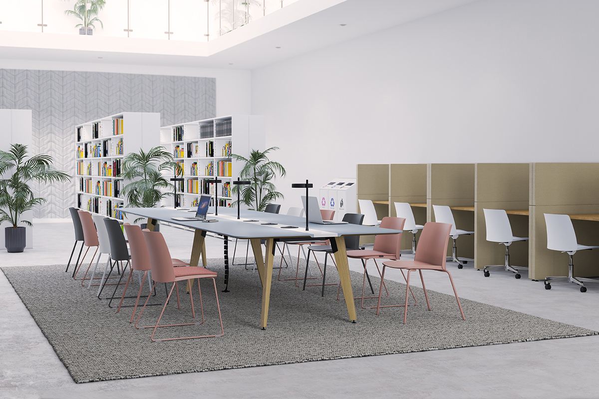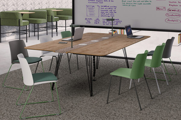 Pype Table & Benches, Astra Collaborative Chairs, Astra Stools & Additions Pedestal Tables
