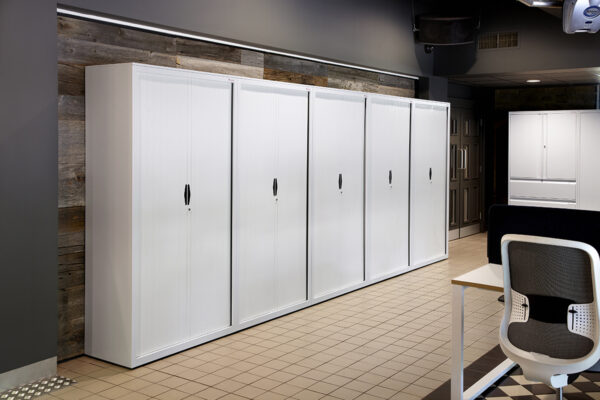 Scrum Pod: 6 Bank of Tambour Storage with Oversailing Top